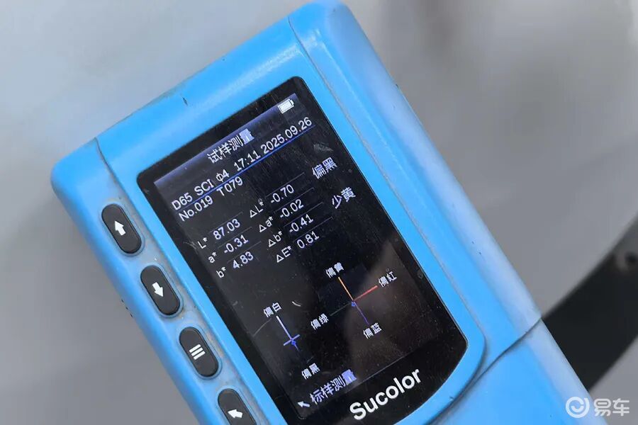 经过测试,最大色差值位于前保险杠处,色差值为0.81ΔE,比基准点偏黑少黄。从数值上来看,这辆车的喷漆工艺质量控制得比较不错!