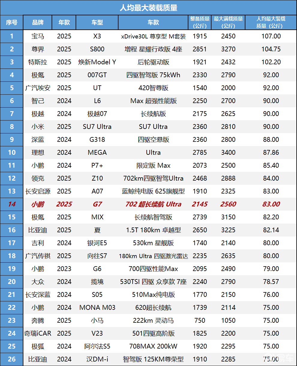 我们这辆车的整备质量为2145千克,最大满载质量为2560千克,计算得出这辆2025款 702 超长续航 Ultra的人均最大装载质量为83千克,超出标准8千克。