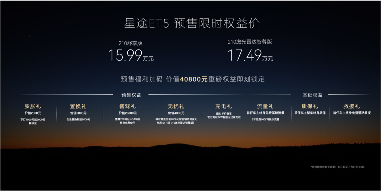 11月13日,星途ET5以15.99-17.49万元的预售价正式入局,宣告了一个“超配时代”的来临。至此,在15-20万元价格区间的中型SUV赛道中,消费者不必再纠结于“选择的悖论”。一车,即可满足你的所有期待!