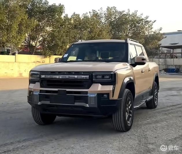 车身侧面,作为一款双排皮卡,尽管整体设计并不显得修长,但棱角分明的线条、外凸的侧踏板、粗壮的前后熏黑轮拱以及哑光网格样式轮毂,共同营造出极具“机甲风”的硬派视觉效果。