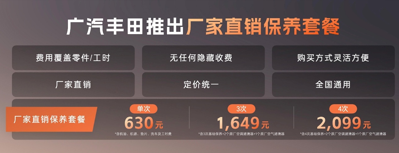 此外,针对用户购车与用车需求,广汽丰田推出厂家直销保养套餐,采用厂家直营、统一定价模式,使用原厂直供零件与标准工艺,费用包含零件与工时,可在全国600余家经销商门店通用。同时,品牌还提供8年低息金融政策,并推出包含混合动力电池、发动机、变速箱在内的三大核心部件终身质保套餐。