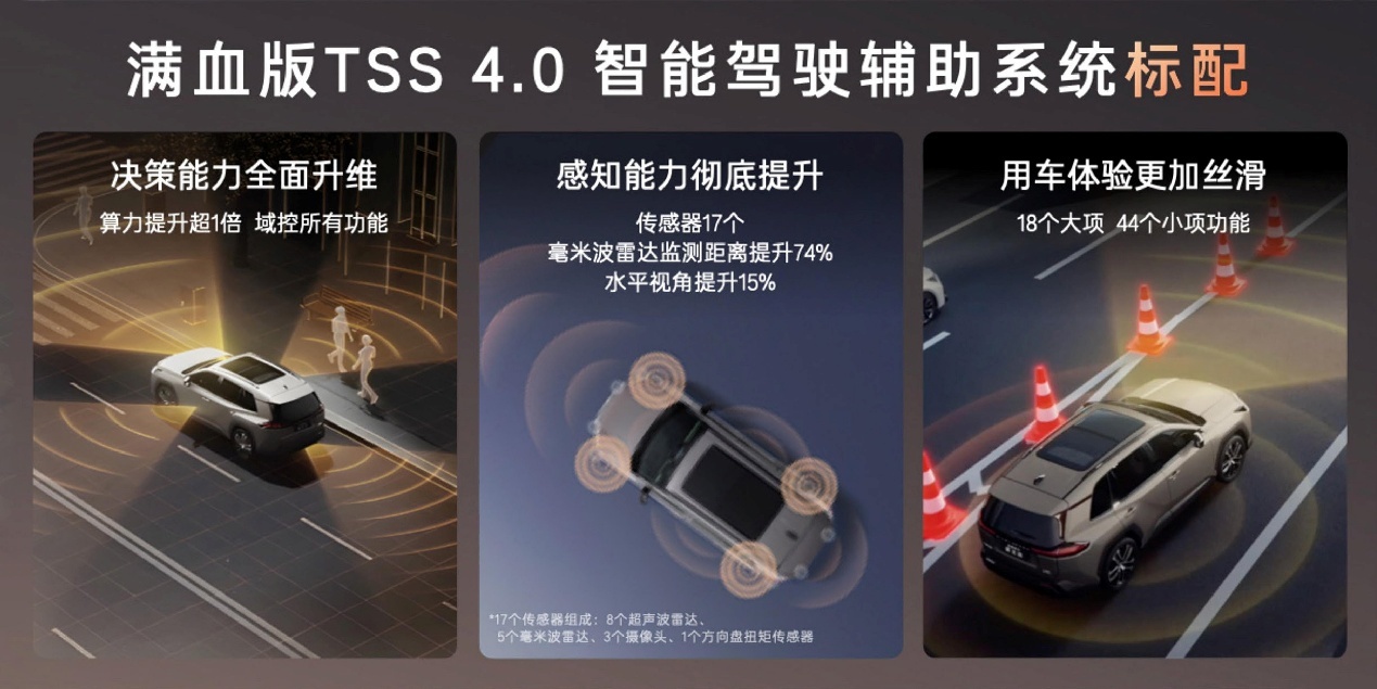 辅助驾驶方面,新车采用域控制电子电气架构,搭载丰田自研的TSS4.0智能驾驶辅助系统,支持动态雷达巡航、车道循迹、道路标识识别辅助、紧急驾驶停止、预判式主动驾驶辅助、泊车辅助制动等功能。