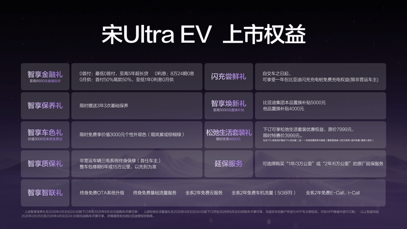 不仅产品给力,比亚迪王朝还为用户提供丰富购车权益与全方位服务体系。构建起从购车、用车到养车的全链路无忧体系,购车有0首付+至高5年超长分期的0元购车方案;用车享一年免费闪充福利;养车有3年3次免费保养承诺。此外,还准备烟岚紫与棕榈绿两款特别车色限时免费选装服务,以及松弛生活套装等丰厚权益,尽显诚意与关怀,也进一步提升宋Ultra EV 闪充版市场竞争力。
