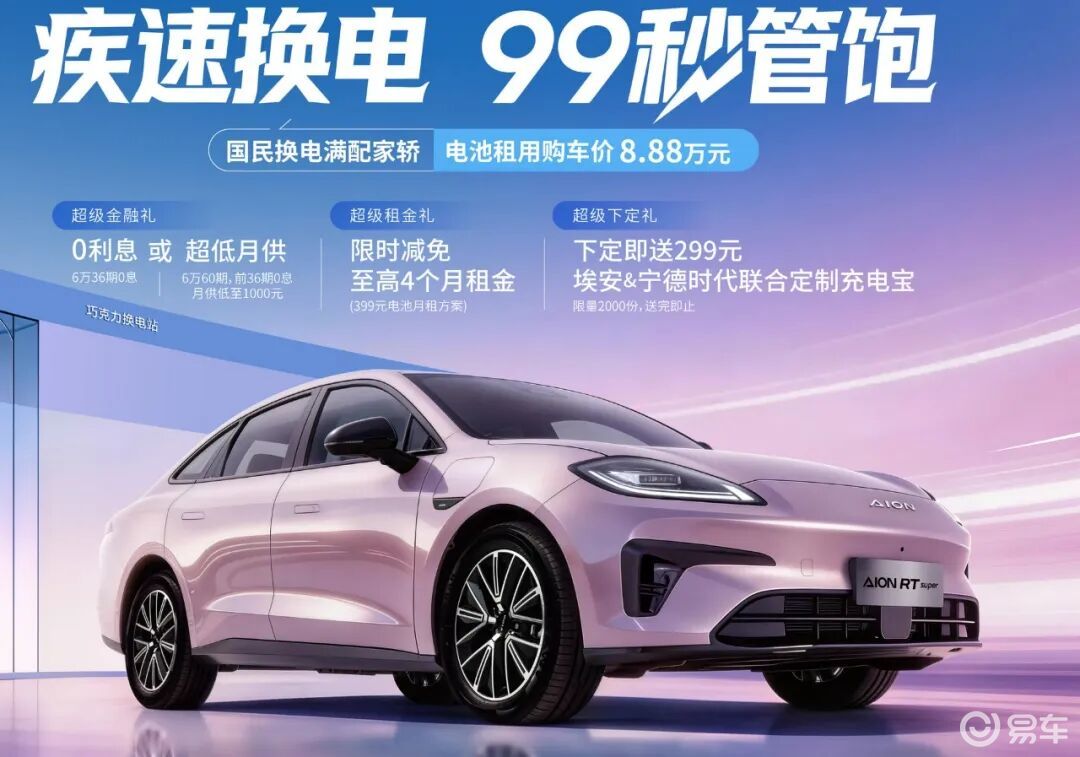 “国民换电满配家轿”埃安RT super的到来,用“补能快、门槛低、配置全”这套组合拳,精准回应了年轻人对效率、经济性和高品质用车的核心诉求。它让续航不再焦虑,让出行更加自由,让每一分钱都花得值得。
