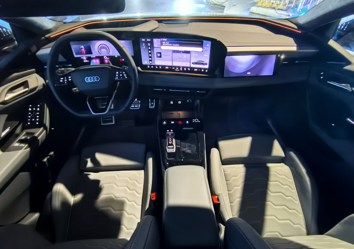 内饰部分,两款车均采用了奥迪最新的家族式座舱设计,Q6L e-tron这边采用环抱式“数字生态座舱”设计,标配由 11.9英寸全液晶仪表盘、14.5英寸触控屏、10.9英寸副驾娱乐屏组成的一体化超感曲面屏。主打一个科技感。