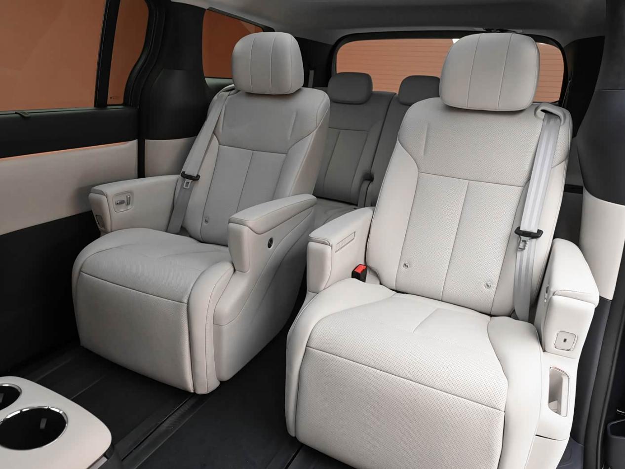 新车车身尺寸5300×1980×1850mm,轴距3200mm,采用2+2+3布局,二排配备零重力航空座椅,支持124°调节、16点位分区按摩、石墨烯加热(3分钟升温至25℃),远距离车程也不会疲惫。三排配备500mm超长坐垫+电动调节+加热功能,中央通道宽度达170mm,无论是主宾还是随行助理,均能获得同等舒适的乘坐席位。